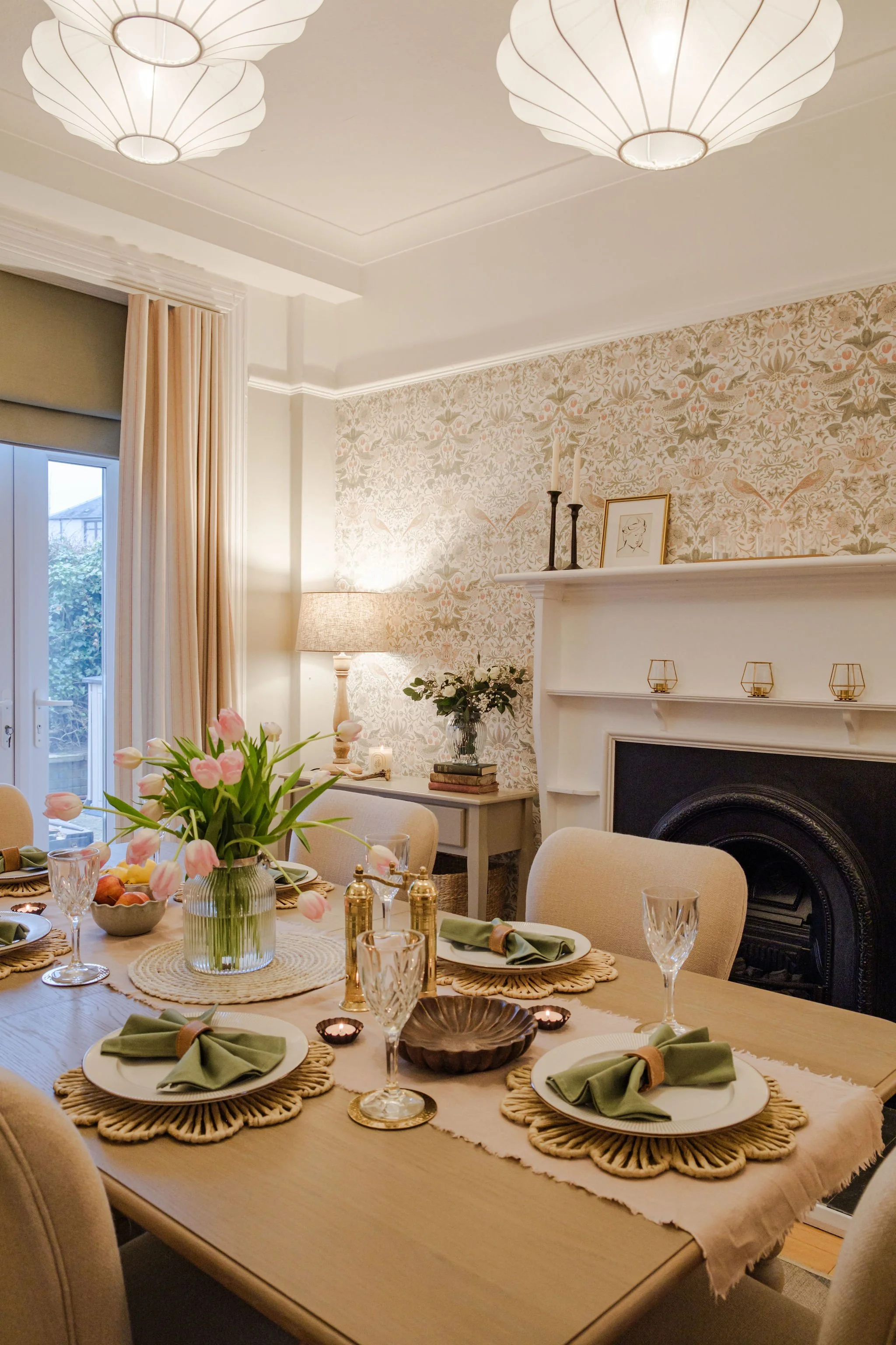 This room also has a charming piano nook where the children practise often, so we wanted to make this a cosy little space from them, too. The fireplace now sings as the wallpaper makes this a feature wall, and we also solved the problem of an off-centre ceiling light by suspending several shades from hooks running the length of the table, which also succeeds in helping to create the wow factor when first walking into the space.