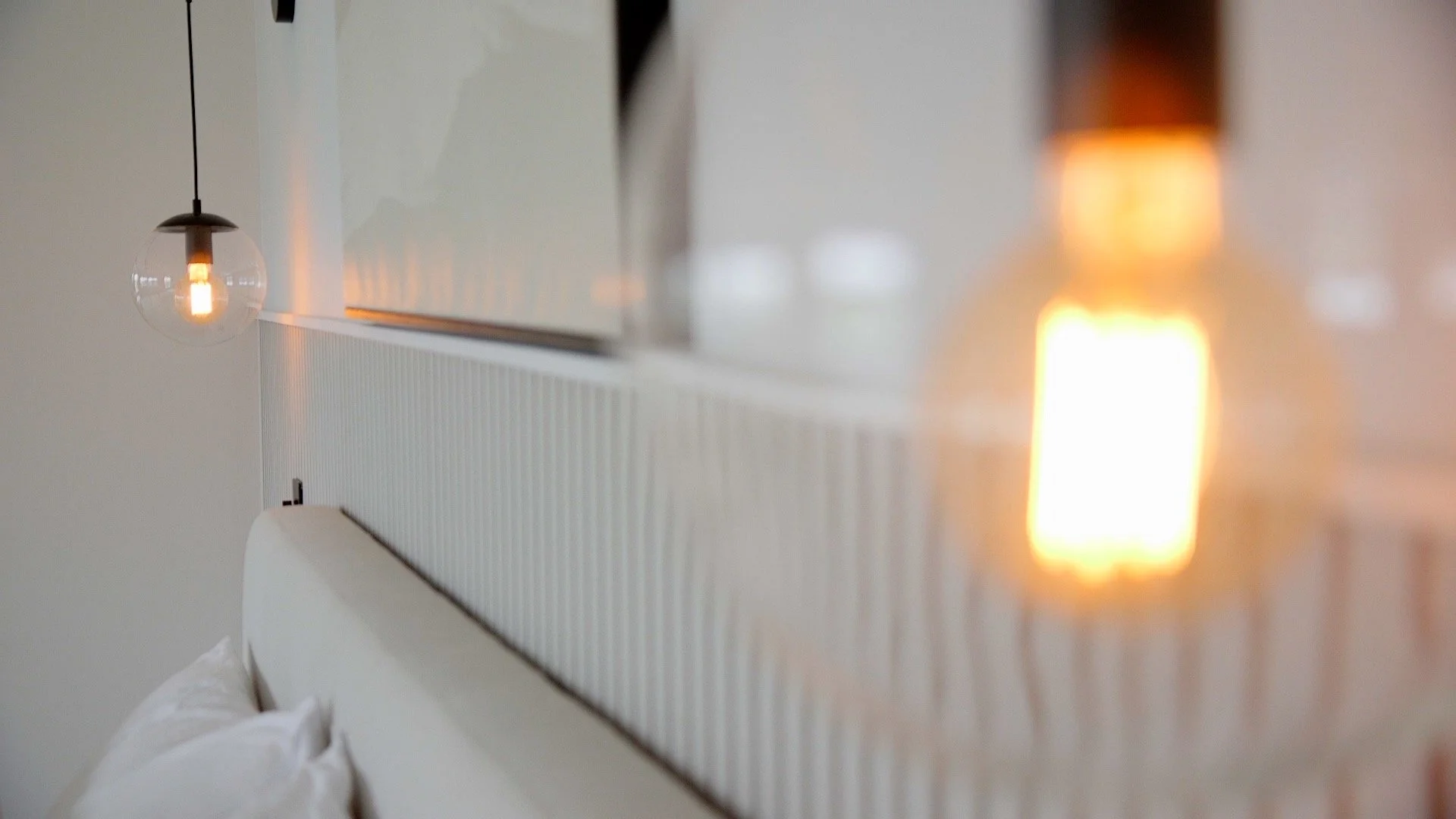 Staying true to a very calming, neutral palette of milky whites, washed oak and beiges really helped create the tranquil feel my clients so desired for this room. Much needed texture was also added in the form of fluted wall panelling to accentuate the bed, as well as a gigantic chunky knit throw, tessellated cushions and other accessories, such as the scalloped ring bowl and oversized woven planter, shown above.