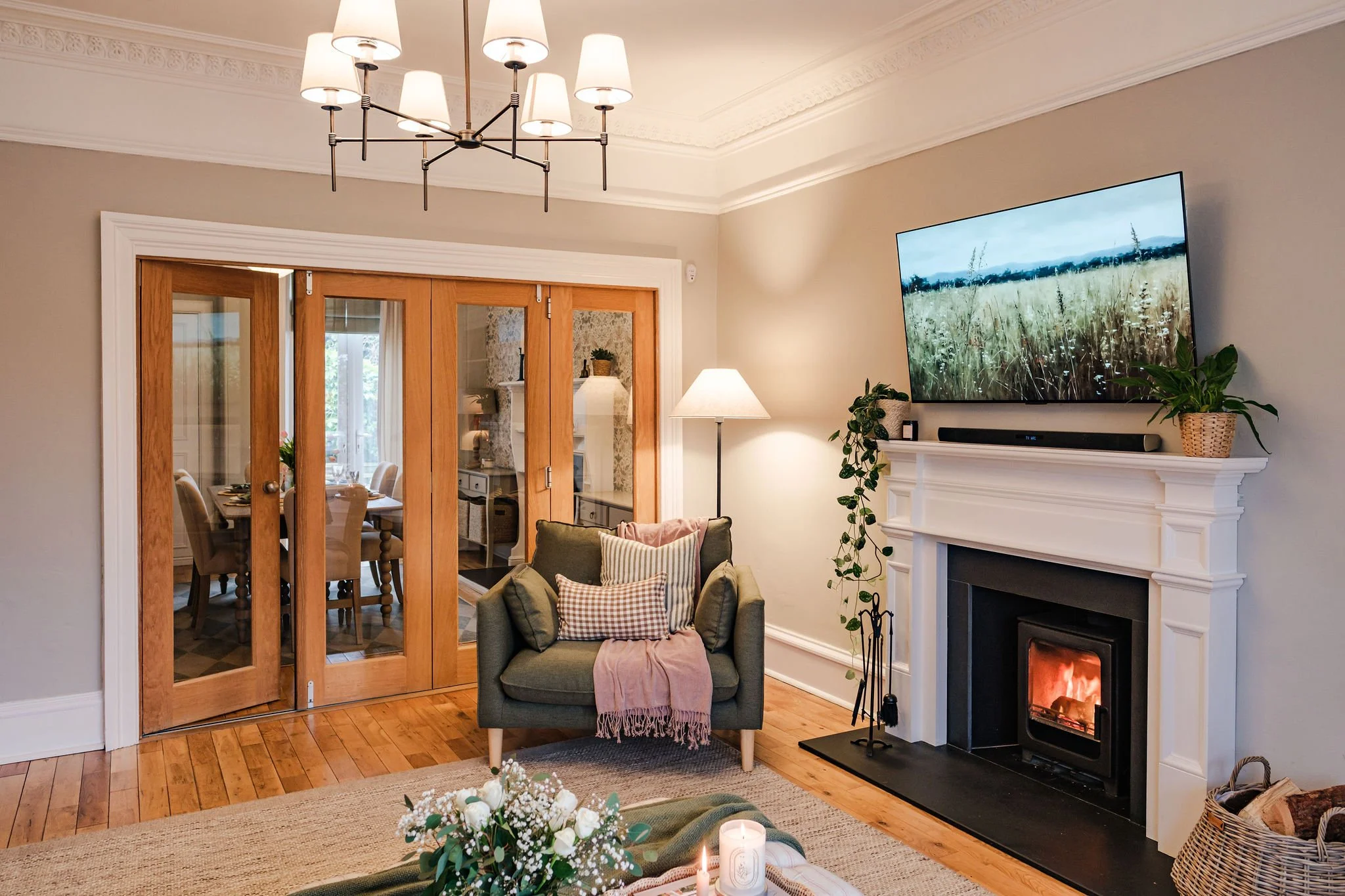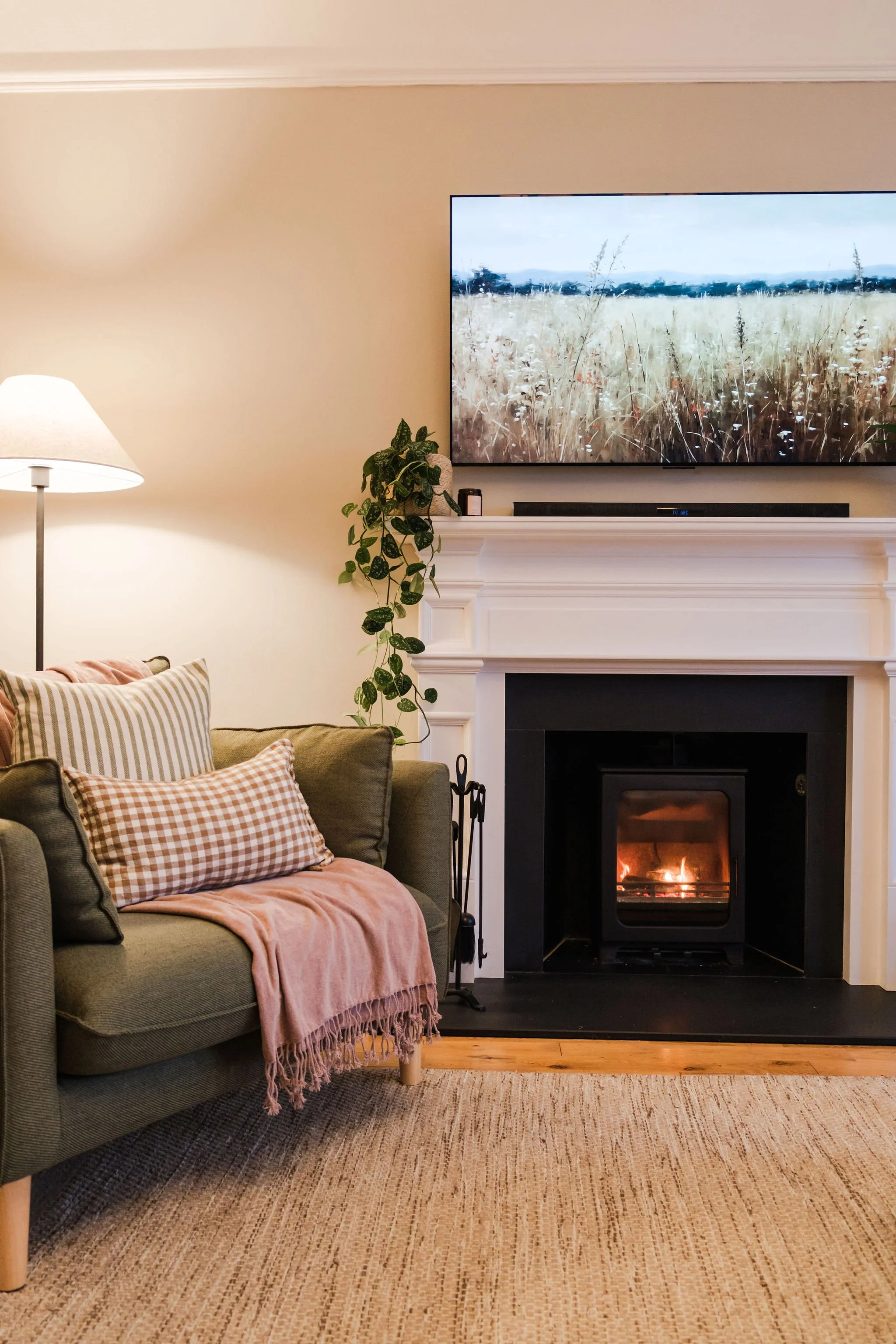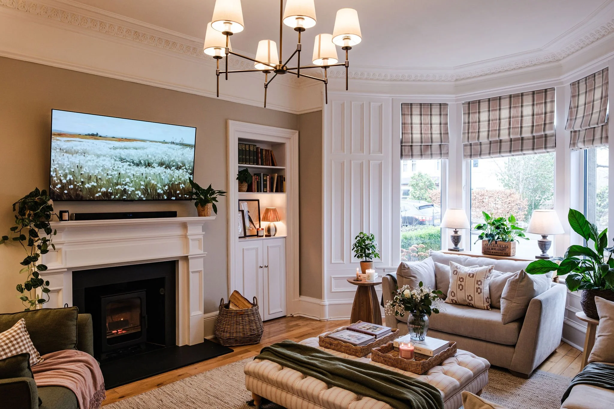 This room already had gorgeous characterful period features, but the fireplace surround was too high to accommodate the TV above (where my clients really wanted it to be placed), meaning it was blocking the Edinburgh Press and throwing the room off-balance. I suggested ideas that allowed their joiner to shorten the lovely mantel surround they already had, meaning that they could keep this, save money AND have the TV in their desired position. Then I pulled together the whole scheme for the room, in consultation with my clients, and returned to style it on photo shoot day, as you see here. Happy clients, happy designer!