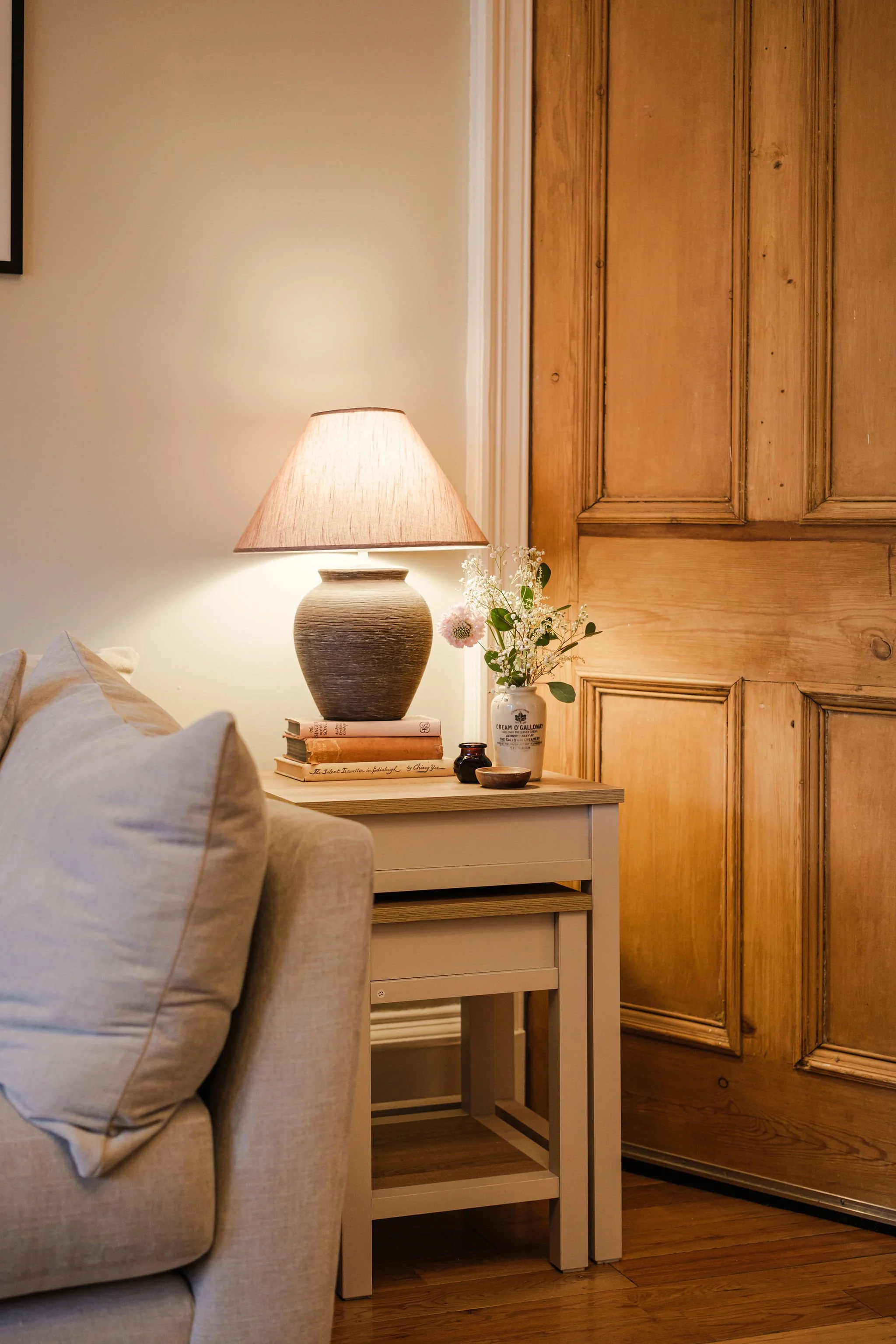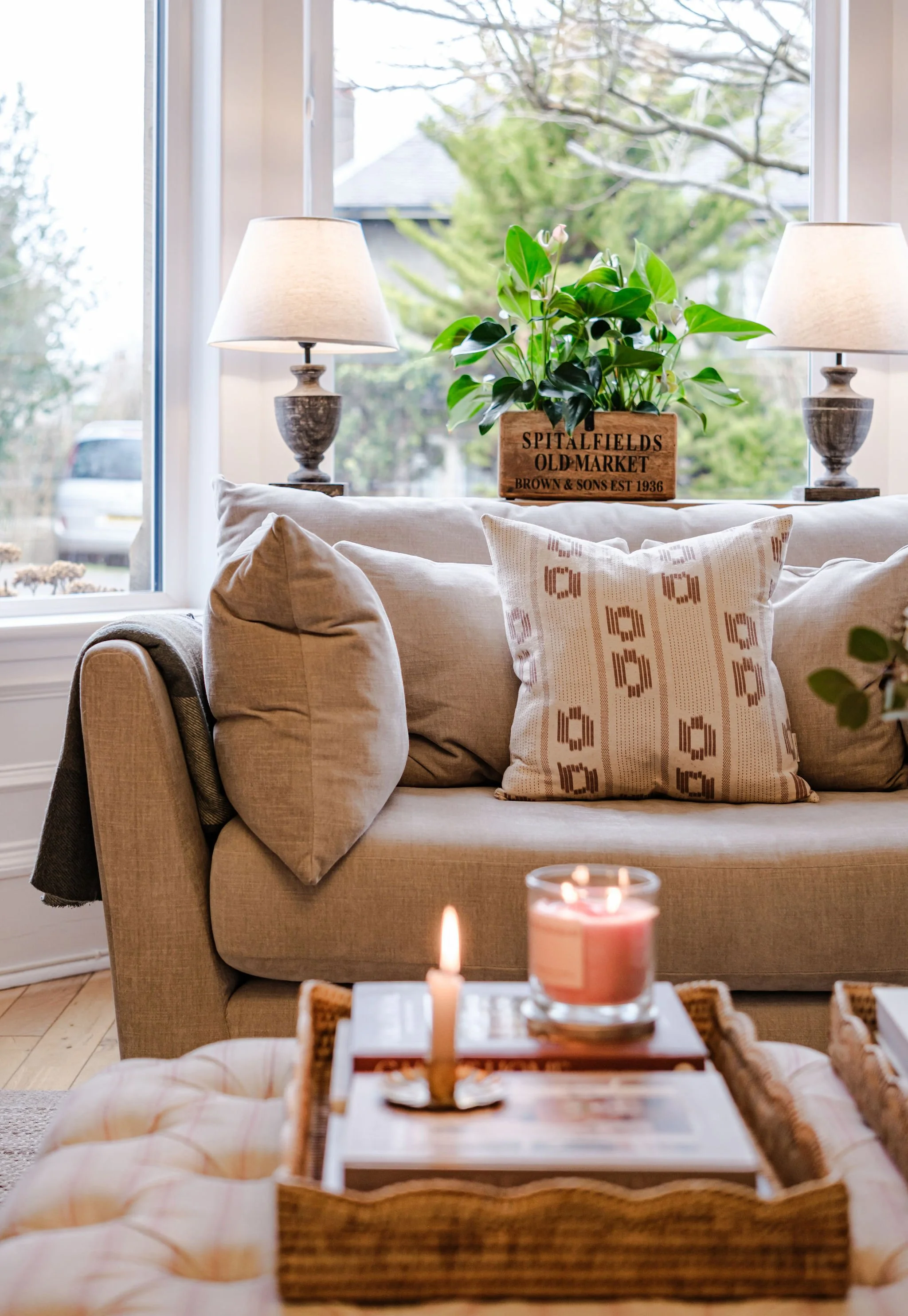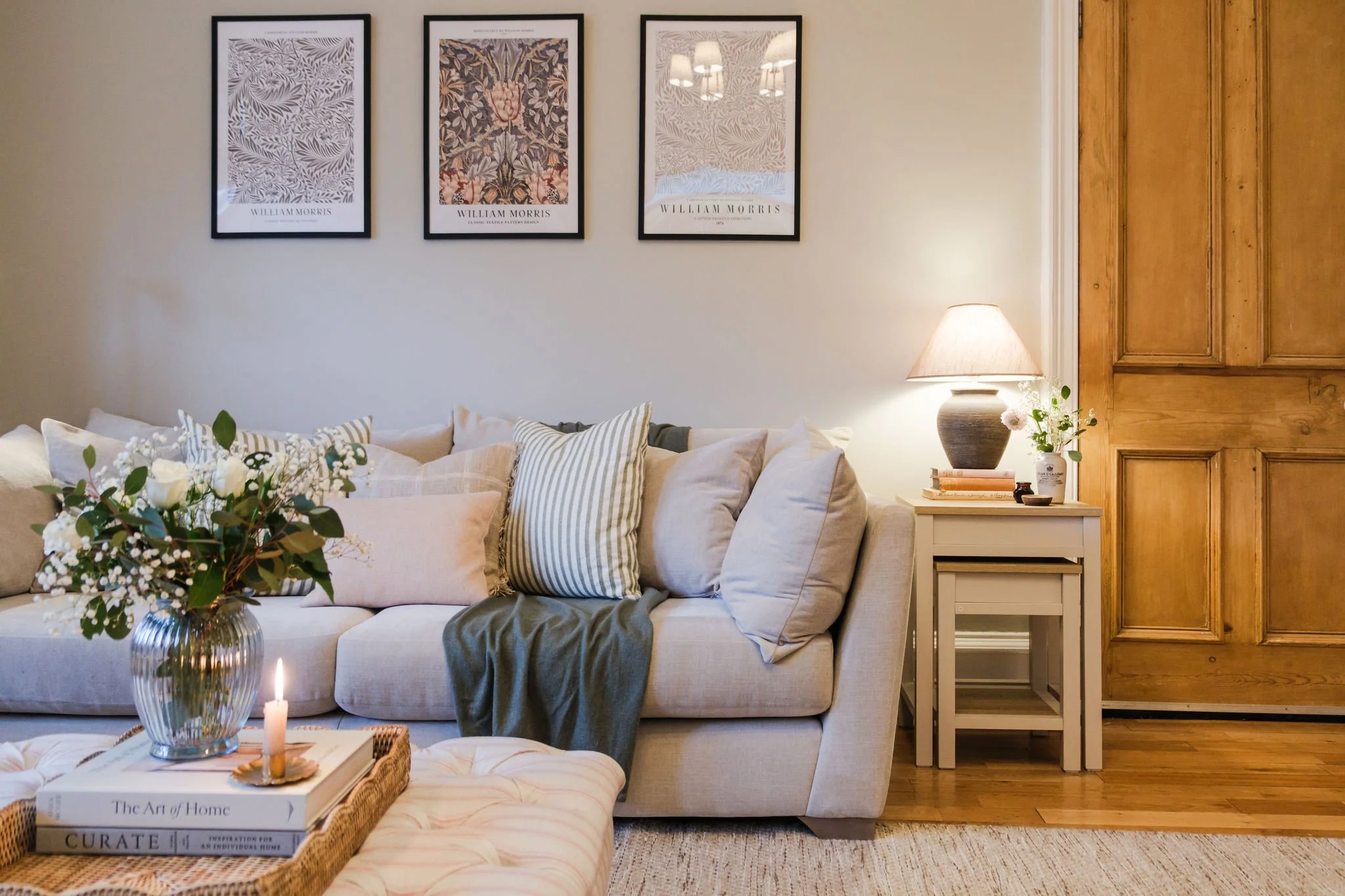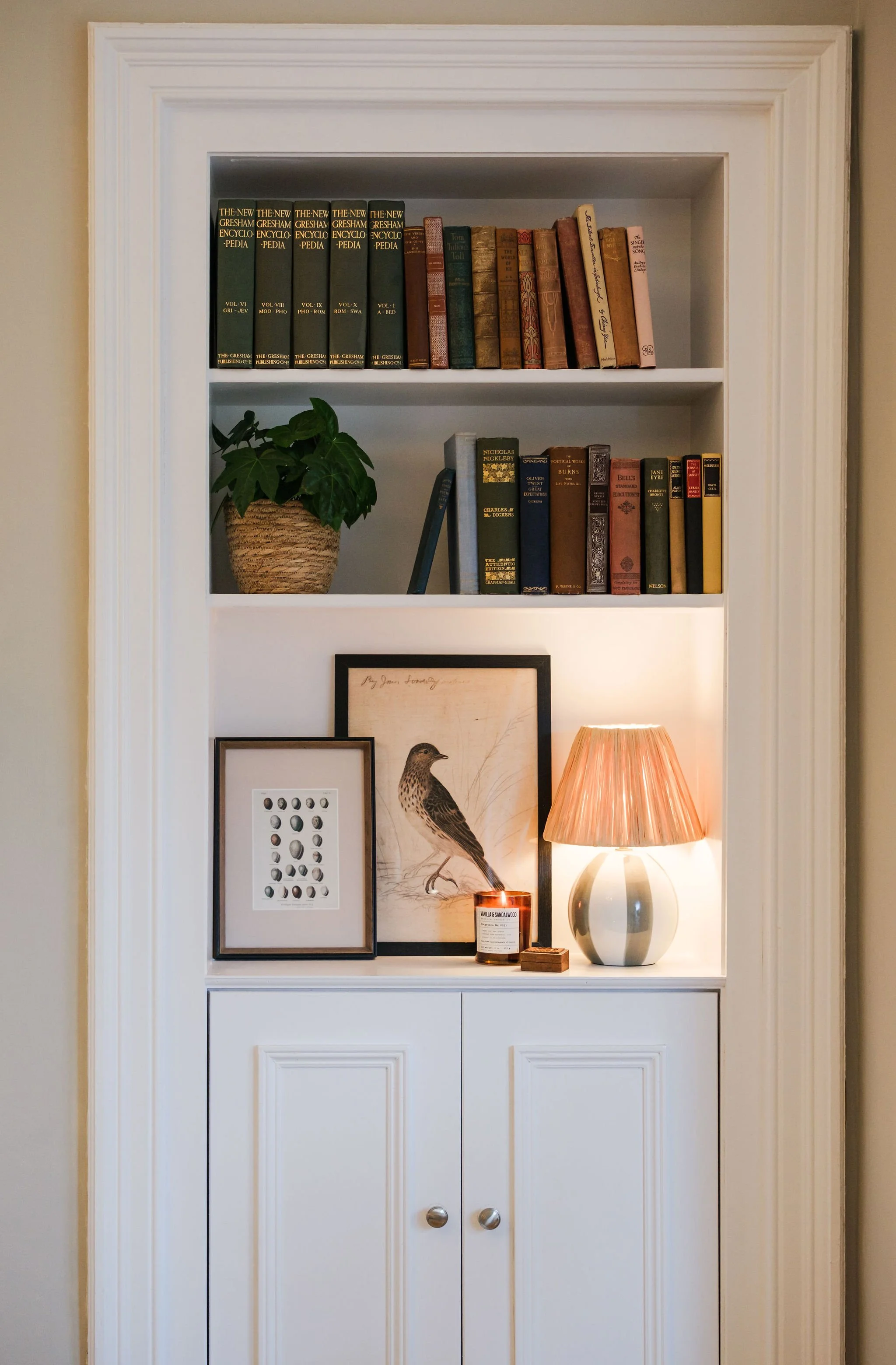 This room already had gorgeous characterful period features, but the fireplace surround was too high to accommodate the TV above (where my clients really wanted it to be placed), meaning it was blocking the Edinburgh Press and throwing the room off-balance. I suggested ideas that allowed their joiner to shorten the lovely mantel surround they already had, meaning that they could keep this, save money AND have the TV in their desired position. Then I pulled together the whole scheme for the room, in consultation with my clients, and returned to style it on photo shoot day, as you see here. Happy clients, happy designer!